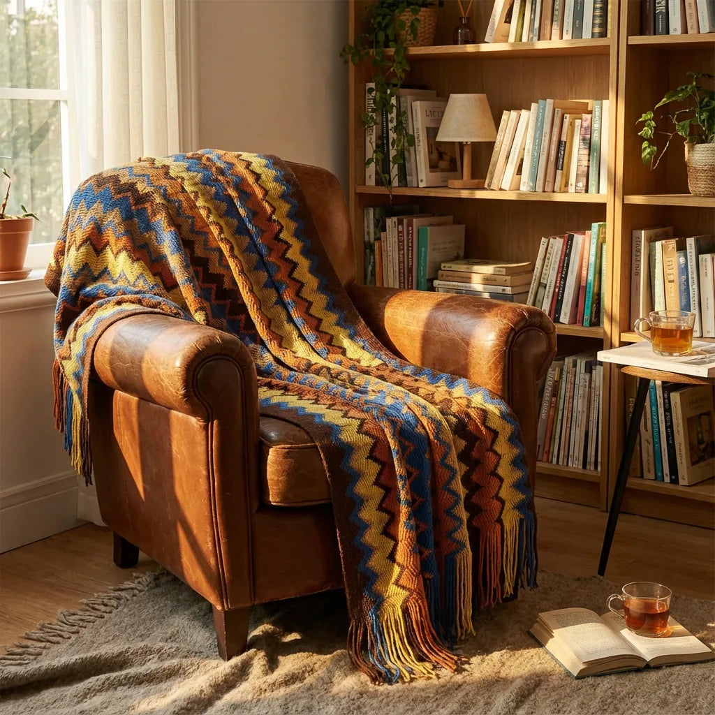 - Boho Chevron Throw Blanket - Soft Knit with Fringes