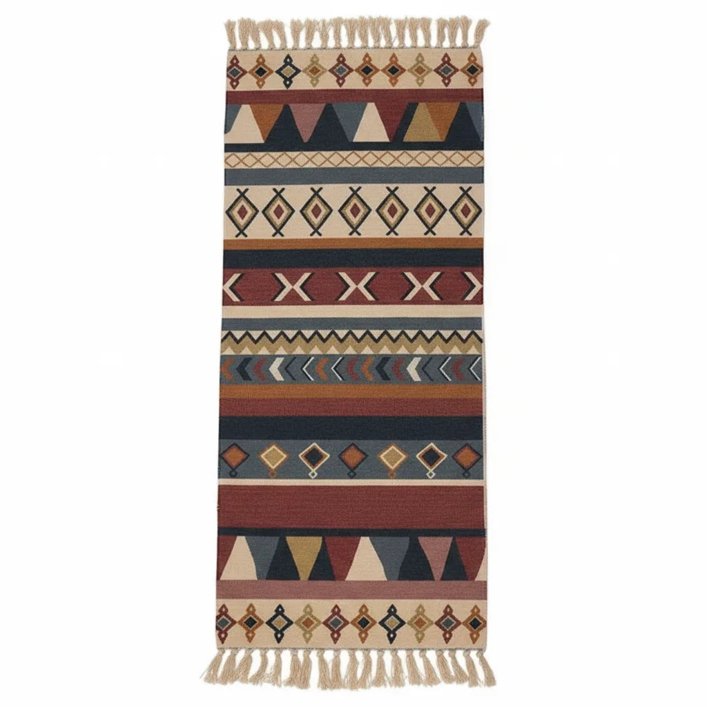 A woven cotton runner with bold geometric patterns and handmade tassels that adds warmth without overwhelming your space.