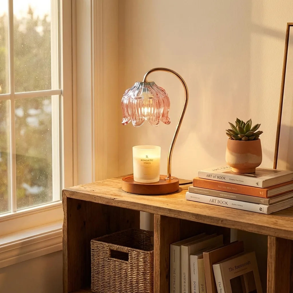 Flower Glass Candle Warmer Lamp - Elegant Wood Base