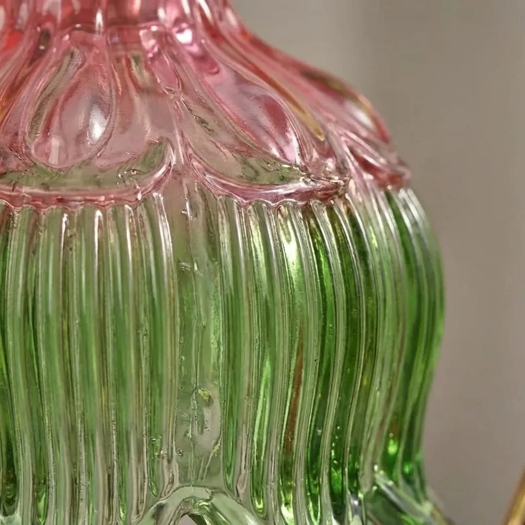 Each tulip shade features hand-finished ribbed glass in soft gradient colors.