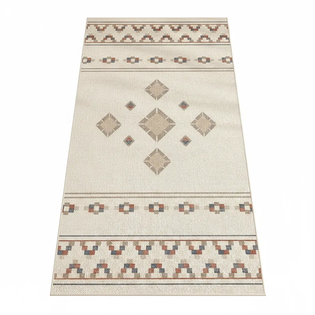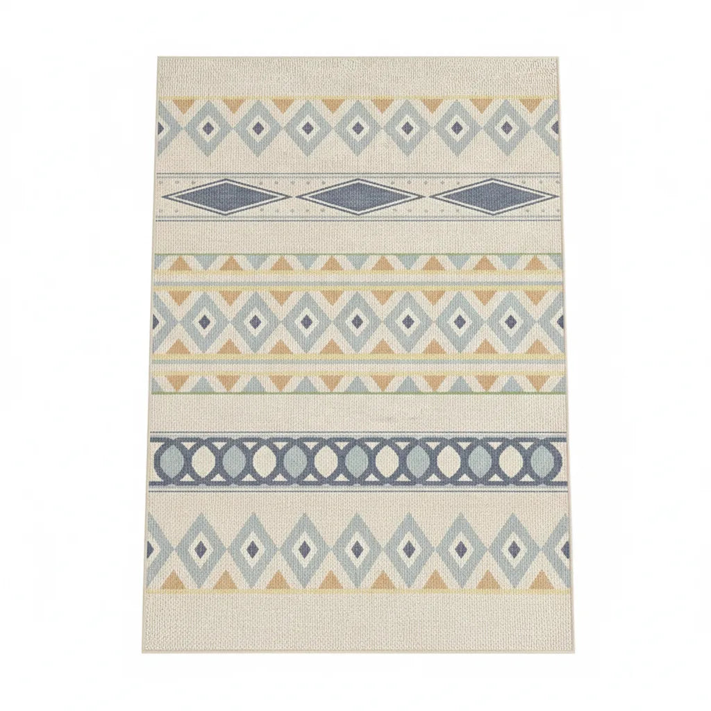 A low-profile area rug with tribal-inspired patterns in soft neutrals. Works in literally any room where you need warmth without the bulk.